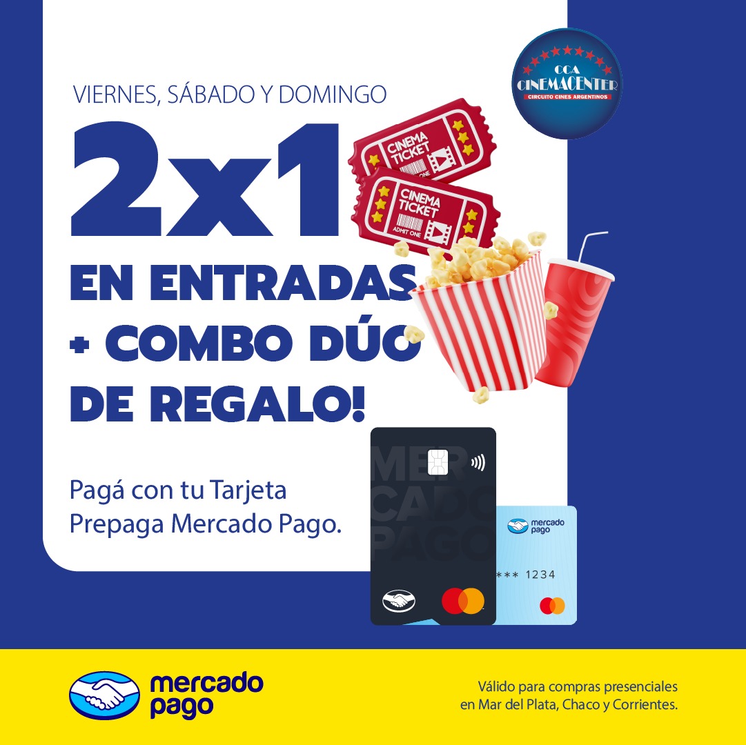 Este viernes 25, sábado 26 y domingo 27 tenés 2×1 en entradas + un combo dúo de regalo, que incluye 1 balde de pochoclos y 2 gaseosas, con tu Tarjeta Prepaga Mercado Pago 💳